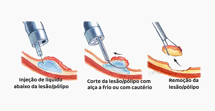 A mucosectomia pode ser realizada em bloco único para lesões menores ou em fragmentos múltiplos (técnica piecemeal) para lesões extensas. A técnica requer maior expertise que a polipectomia simples e tempo de procedimento mais prolongado.
